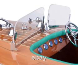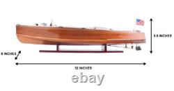 This Chris Craft powerboat has been hand varnished with many coats of clear varnish. On the triple cockpit, you will find a variety of beautiful handcrafted cast chromed & brass metal parts such as: metal front windshield frame, gauges, steering wheel, horns, running lights, brass propeller, rudder and much more. Size: 32" overall L x 8.5" H x 9 W. Chris Craft Triple Cockpit Wood Speed Boat Model 32. This high quality, highly detailed, modern style.